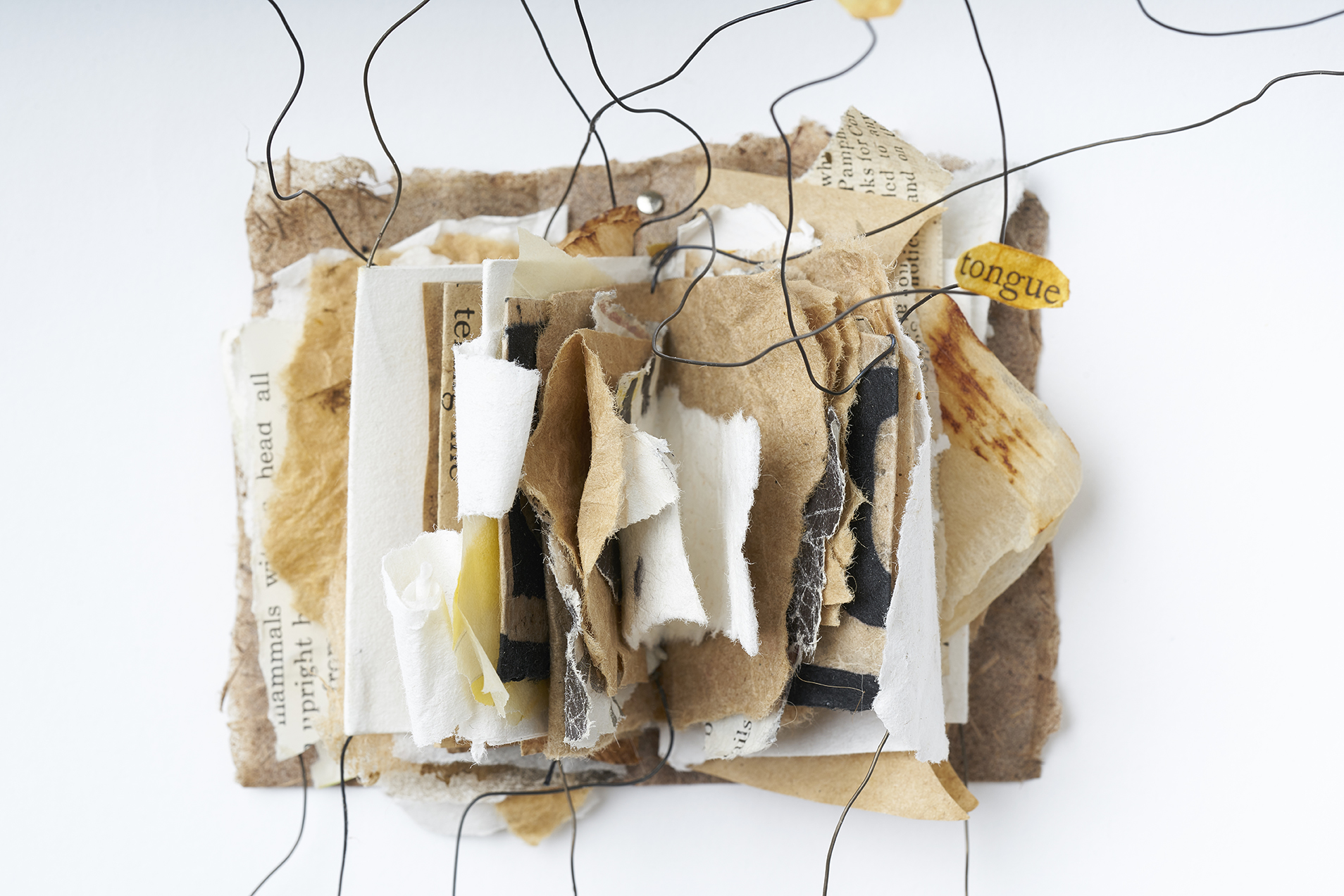These handmade and altered books are created using a range of materials—ink, paint, paper and cardboard of all kinds, tea dye, kakishibu, eco-dyes, wire, and string—and processes such as burning, sewing, cutting, and sanding. Some pages hold fragments of my poetry or photographs. With a minimum of words, I’m exploring the essence of what a book can be—its form, feel, and subtle power to hold and withhold.